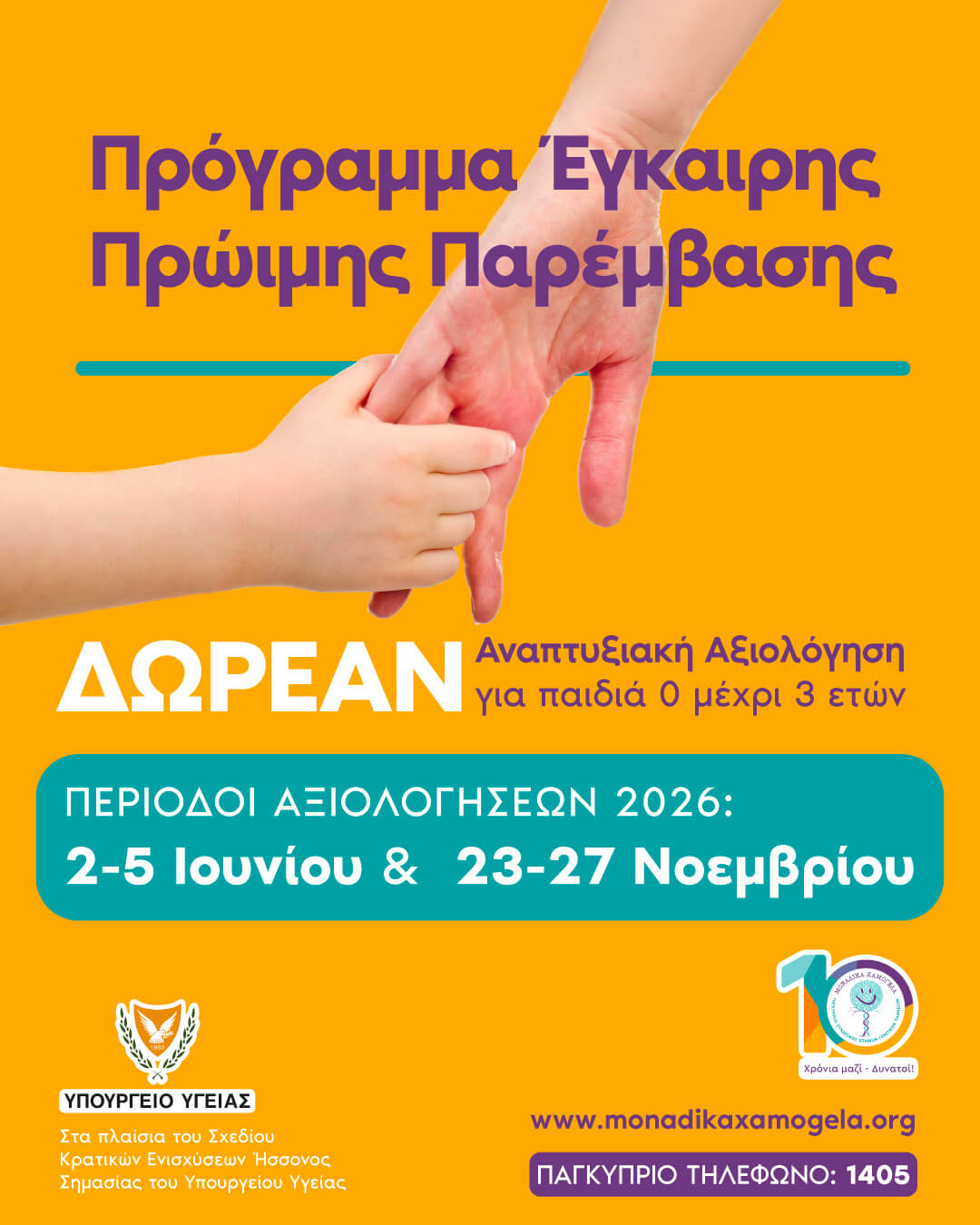 Το πρόγραμμα Έγκαιρης Πρώιμης Παρέμβασης είναι συγχρηματοδοτούμενο του Παγκύπριου Συνδέσμου Σπάνιων Γενετικών Παθήσεων ‘Μοναδικά Χαμόγελα’ και του Σχεδίου Κρατικών Ενισχύσεων Ήσσονος Σημασίας του Υπουργείου Υγείας, βάση του Κανονισμού 360/2012 της Επιτροπής για την παροχή Υπηρεσιών Γενικού Οικονομικού Συμφέροντος (ΥΓΟΣ) 2023.